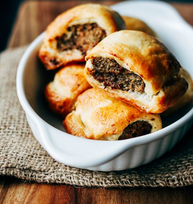 Bestrijk de bladerdeeghapjes met het losgeklopt ei en leg ze met de plakkant naar beneden op de bakplaat. Bak de hapjes goudbruin en gaar in ± 20 minuten.